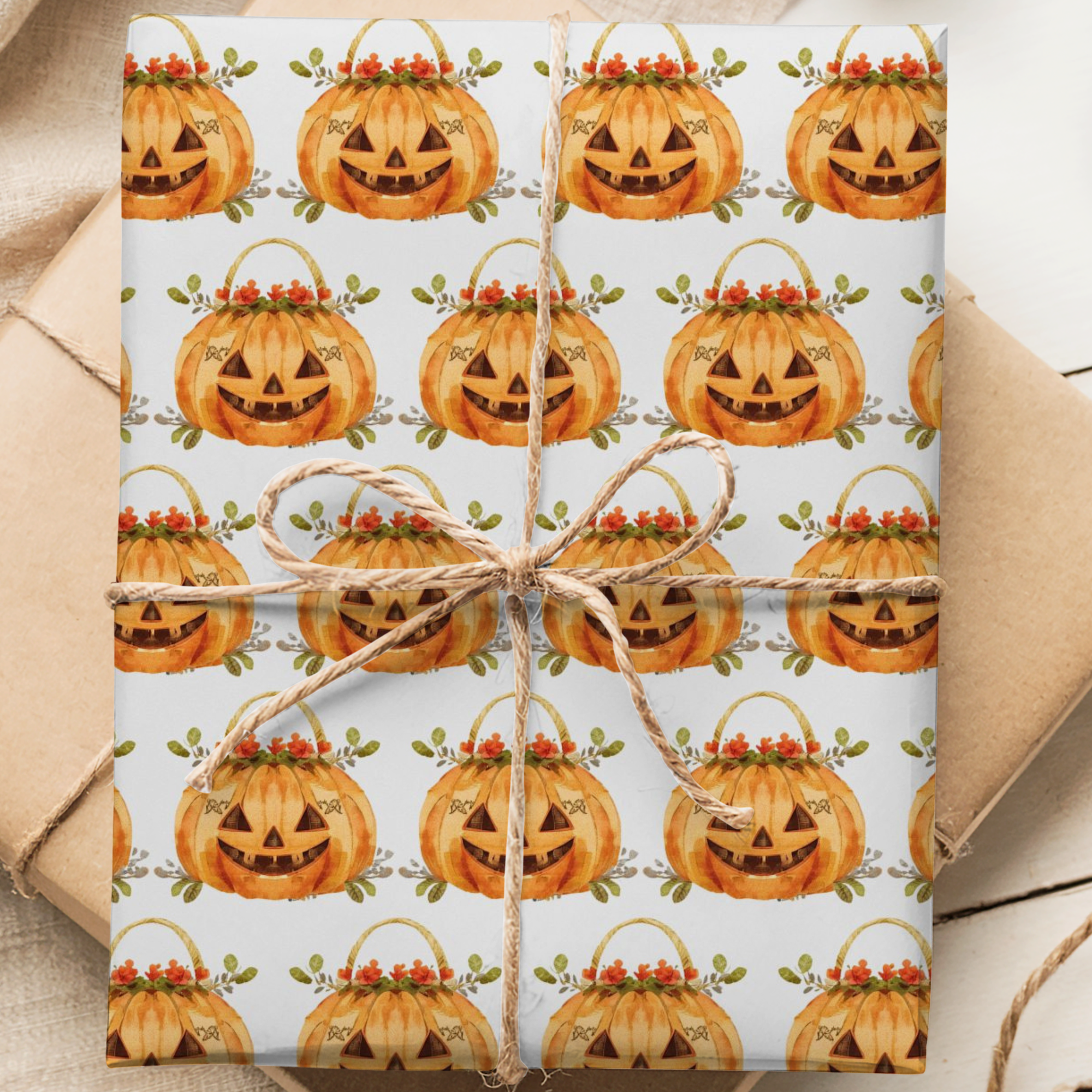 Vintage Halloween wrapping paper featuring smiling jack-o’-lanterns and fall leaves