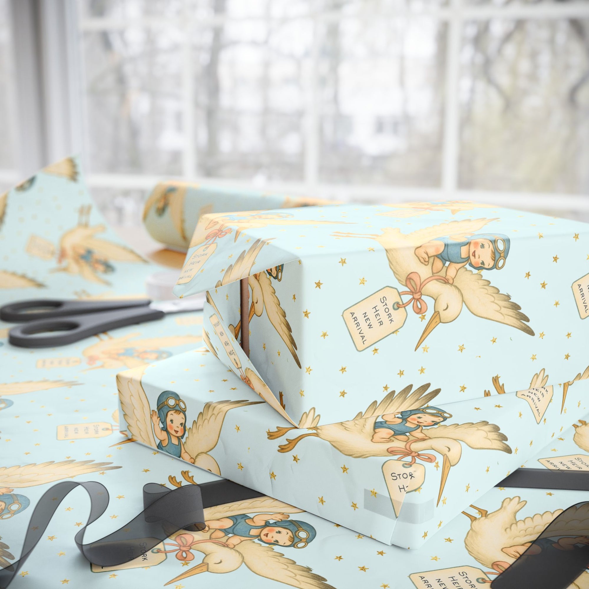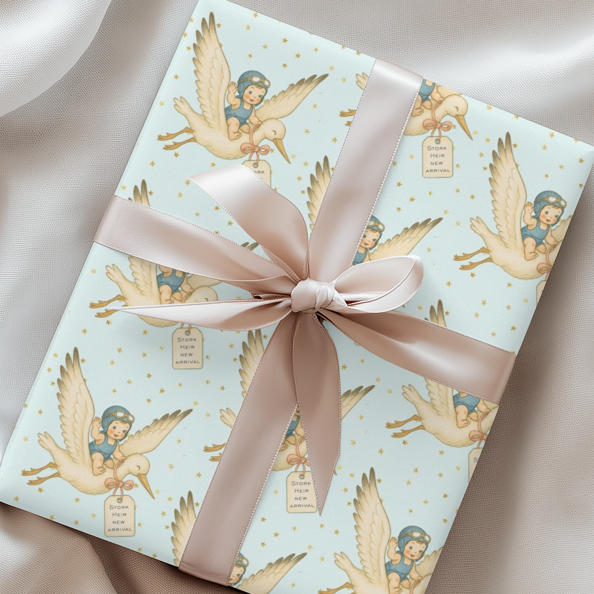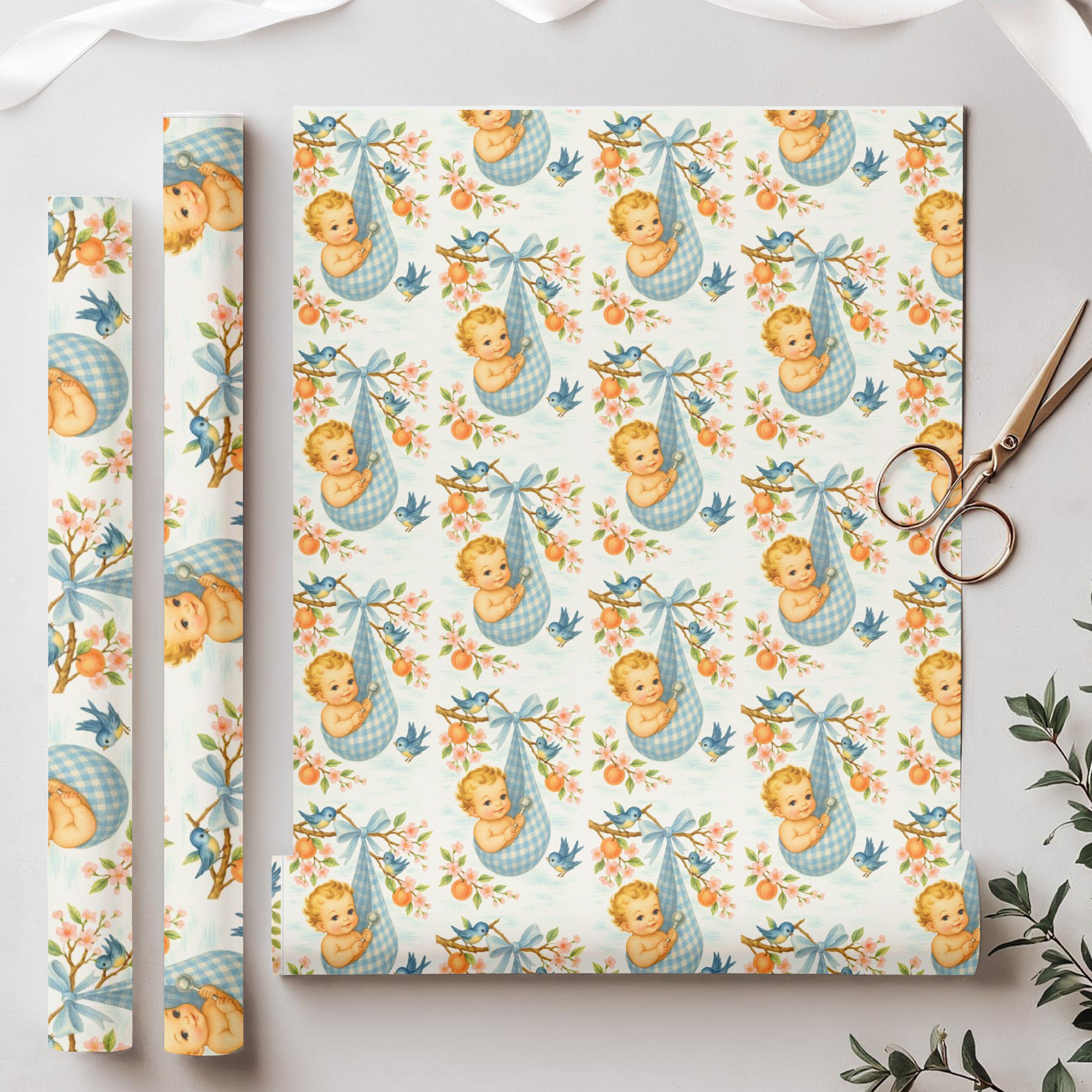 {"type":"root","children":[{"type":"paragraph","children":[{"type":"text","value":"Welcome the newest bundle of joy in true vintage style with our "},{"type":"text","value":"New Baby Wrapping Paper Collection","bold":true},{"type":"text","value":". Inspired by 1940s–1950s greeting cards, each design features storks, peach blossoms, bluebirds, and pastel gingham slings. Perfect for baby showers, gender reveals, and newborn gifts, these sweet patterns turn every present into a keepsake moment. "}]}]}