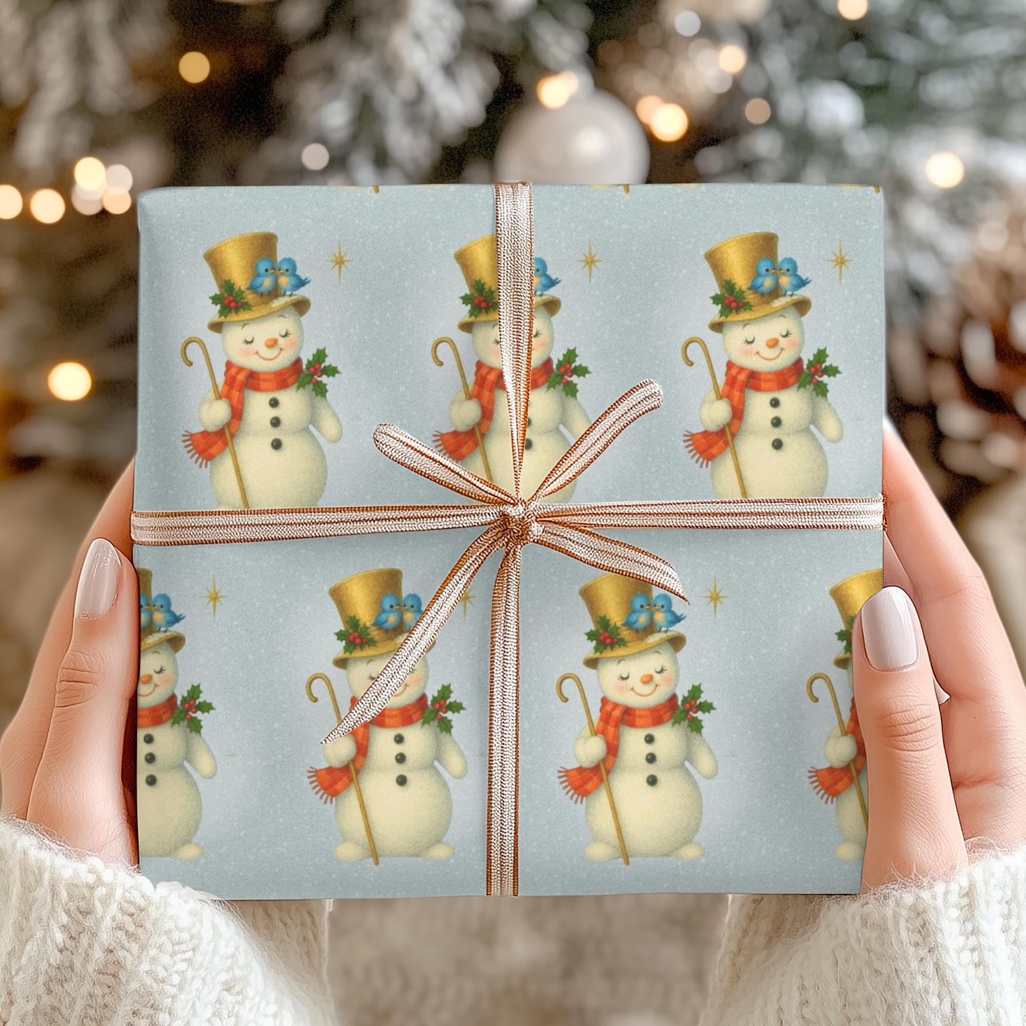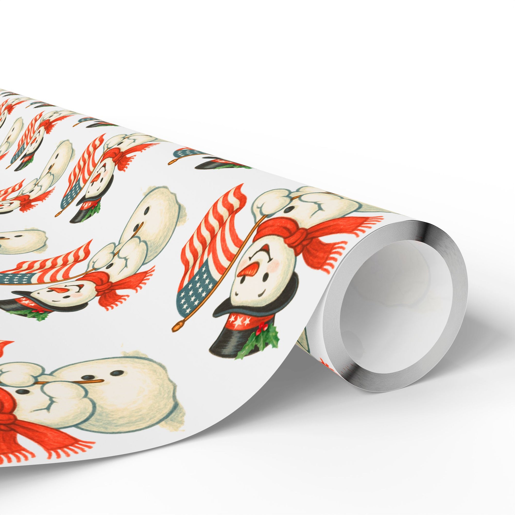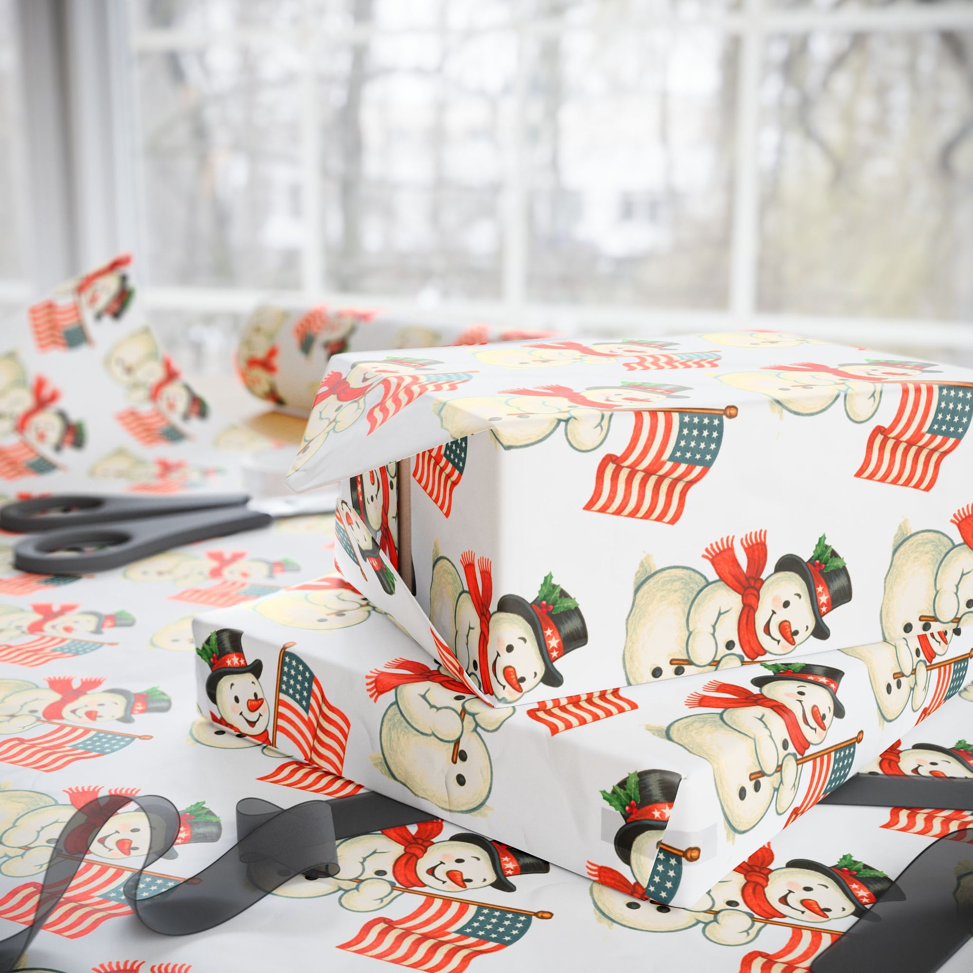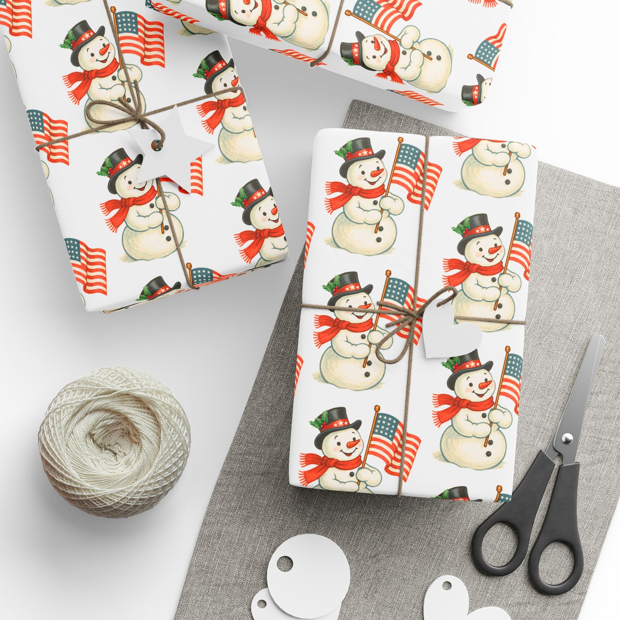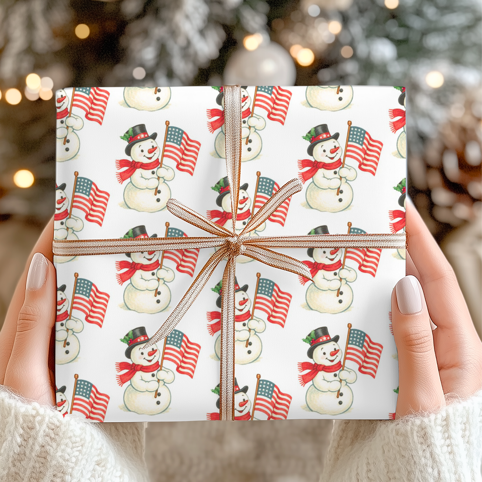 a  box that is wrapped in a christmas design that features a snowman and american flag against a light blue background