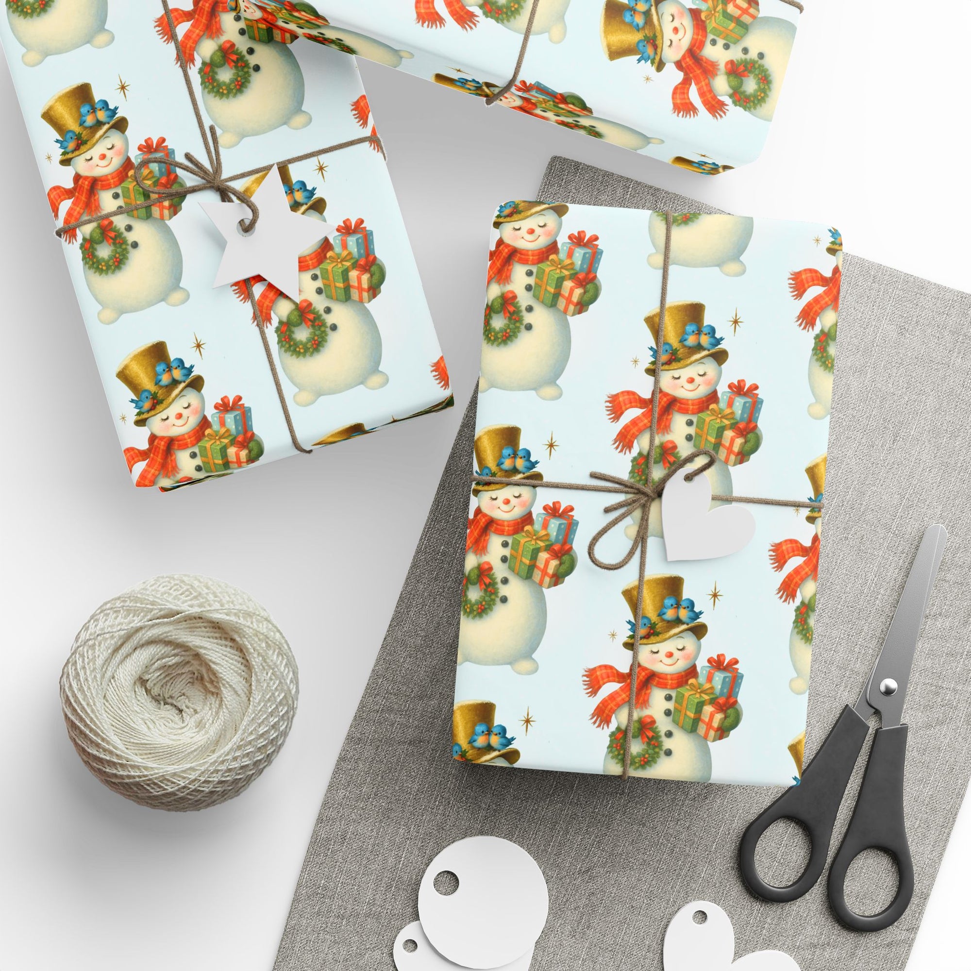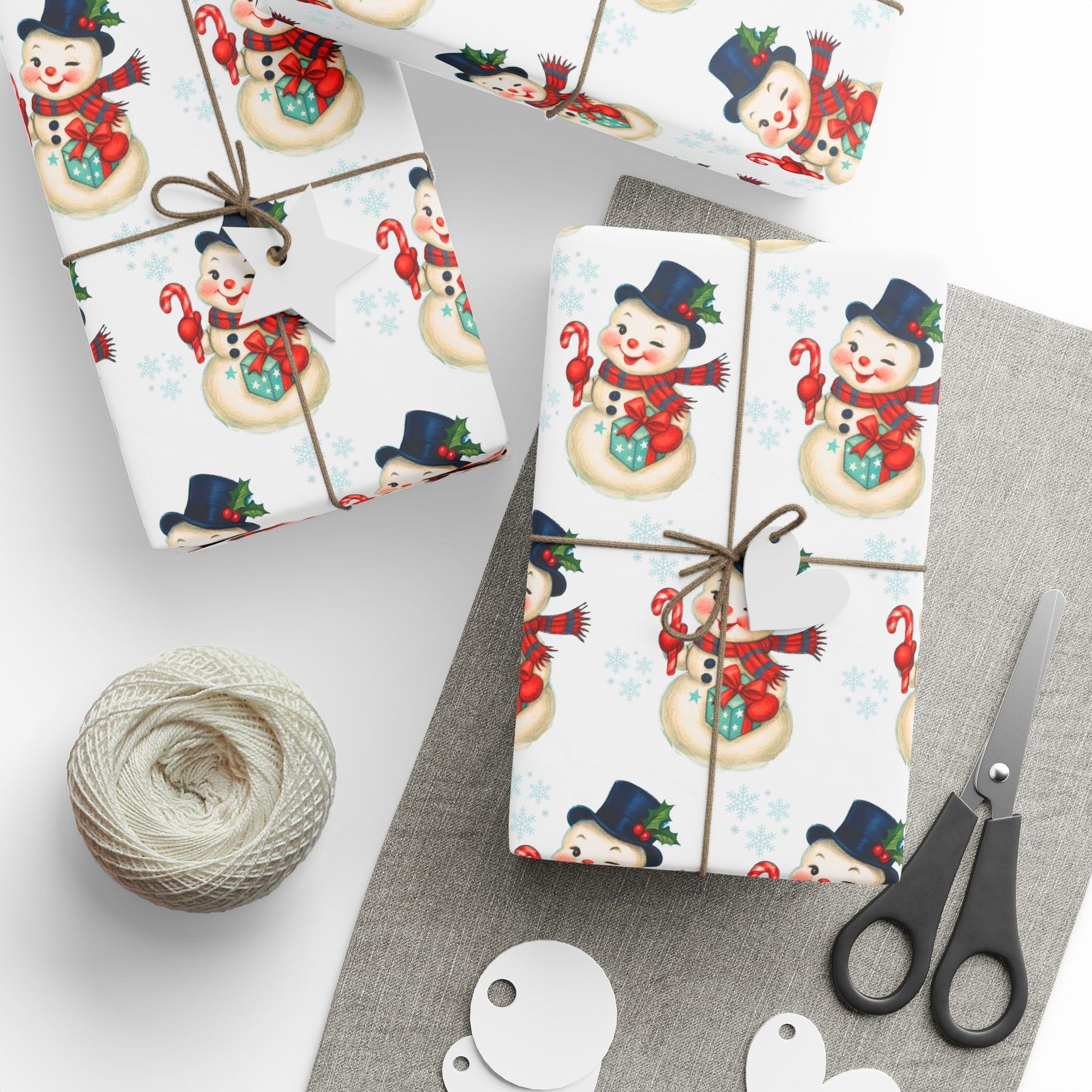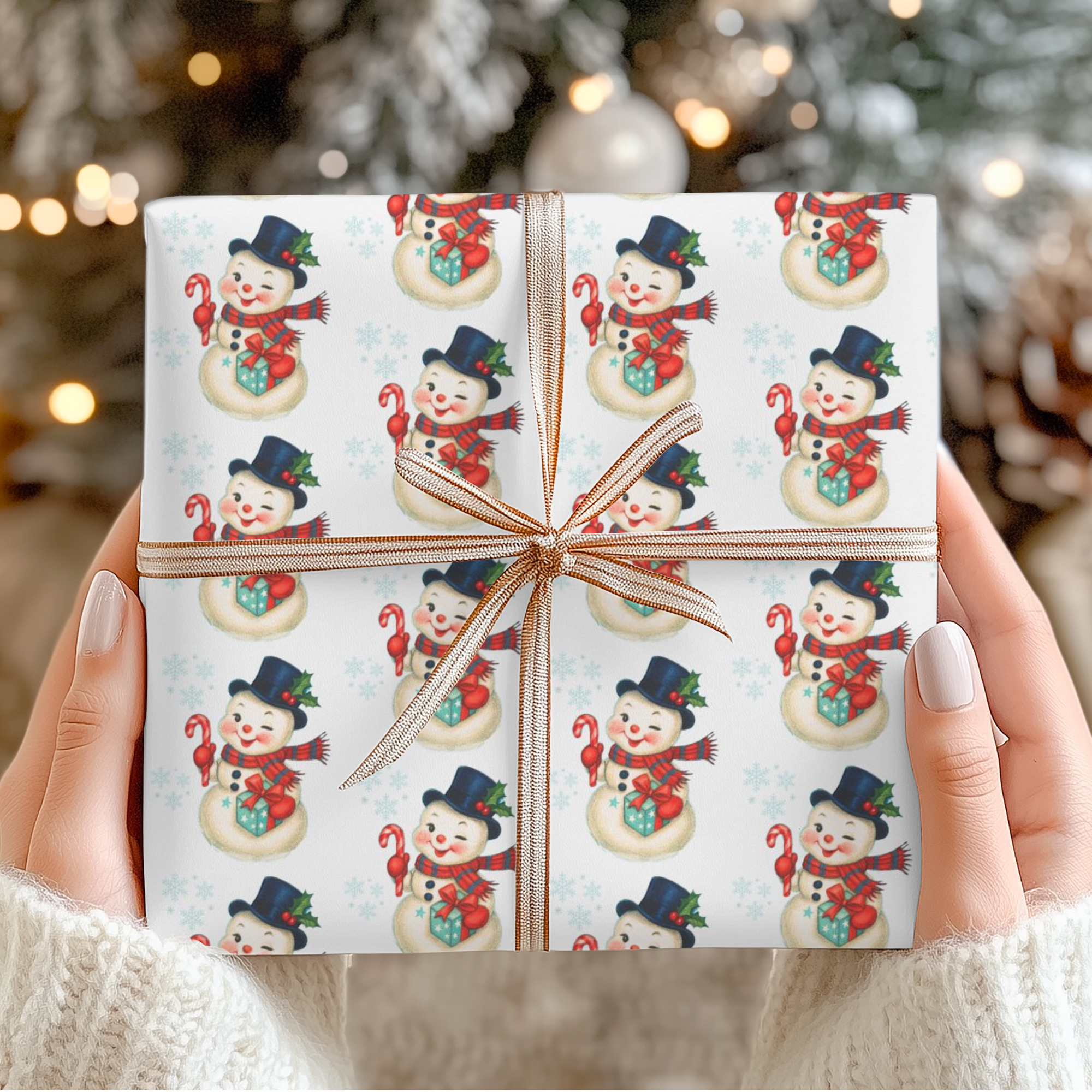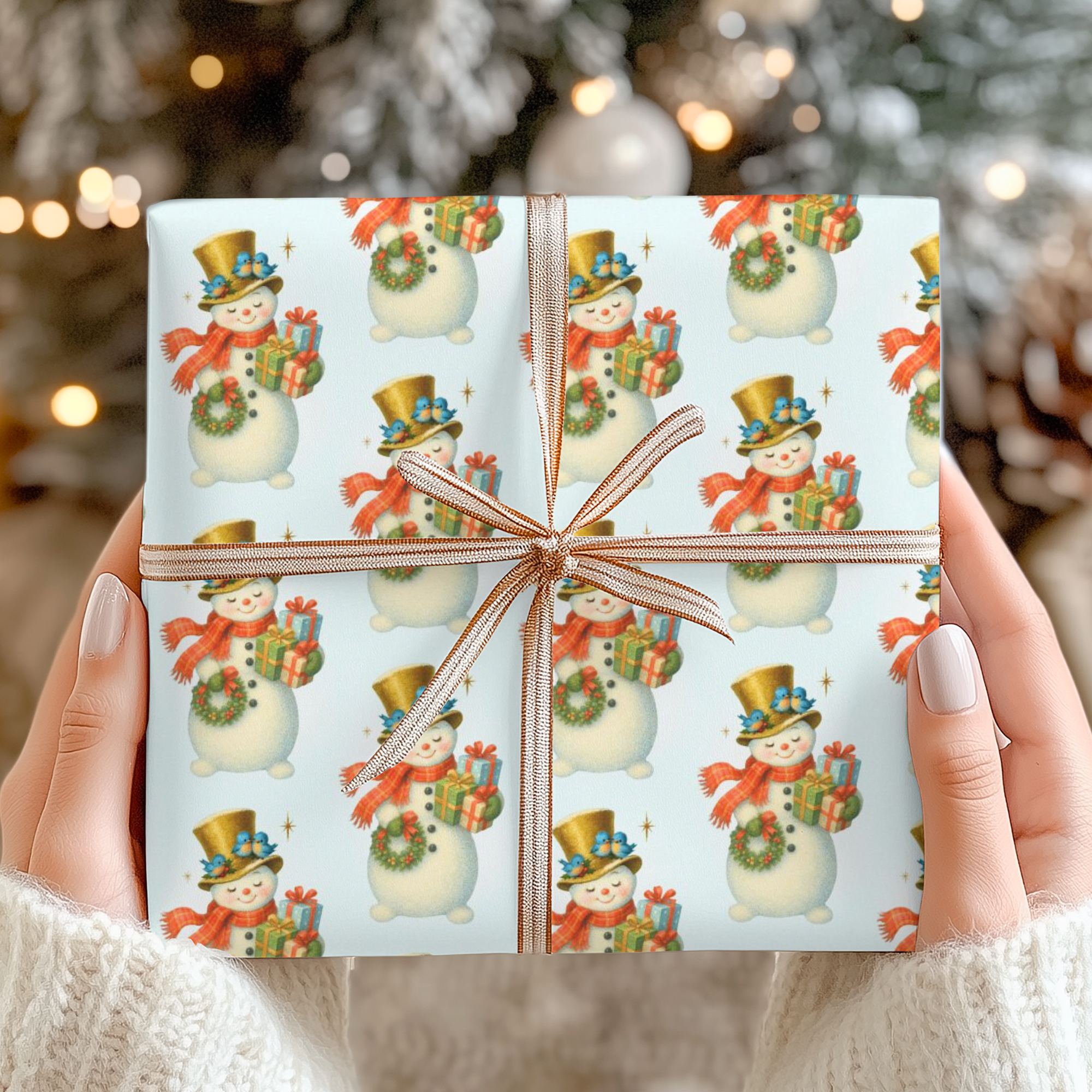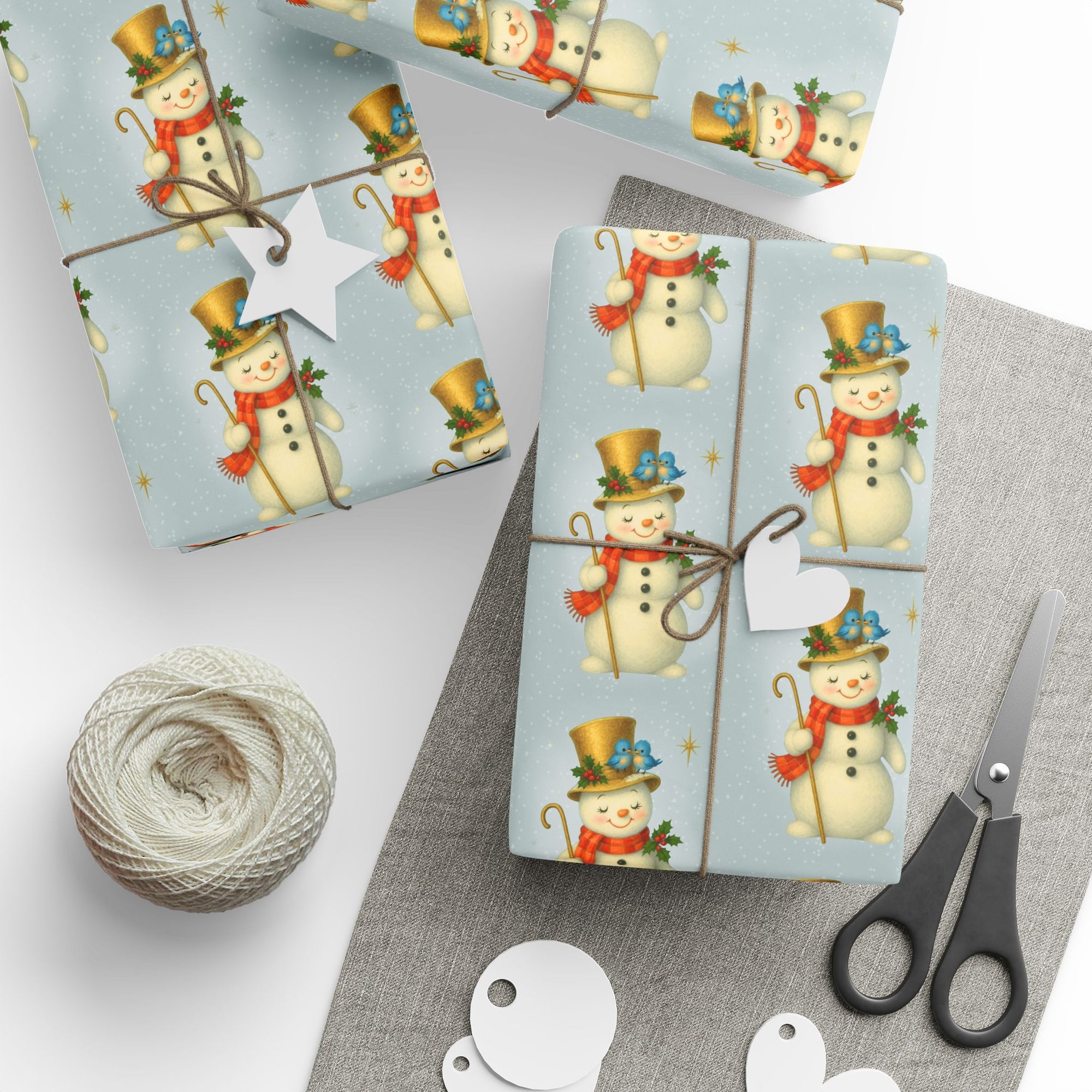 a  box that is wrapped in a christmas design that features a snowman and american flag against a light blue background