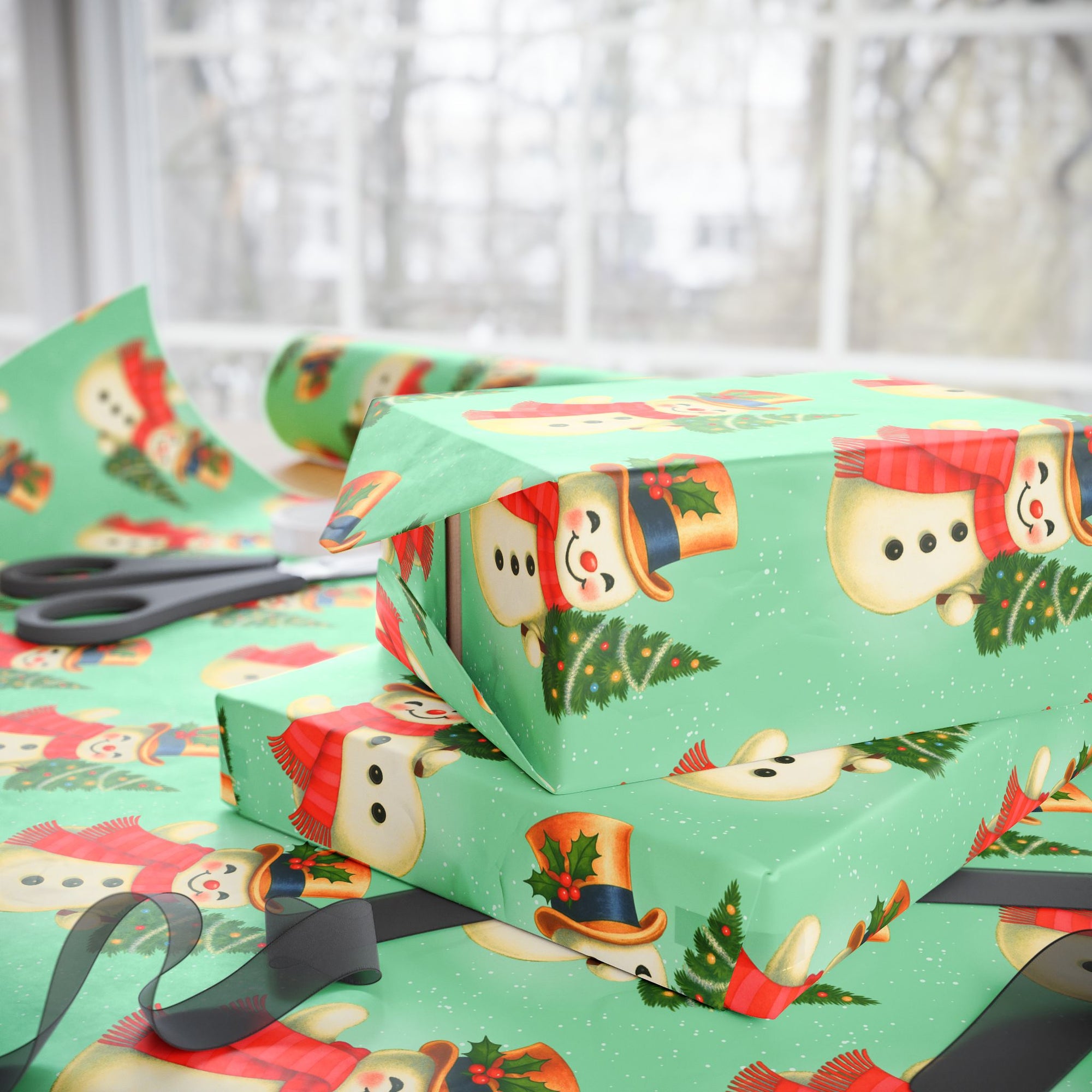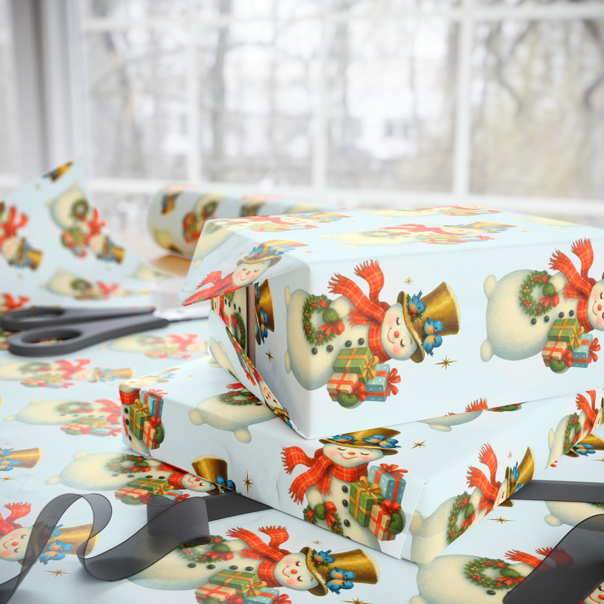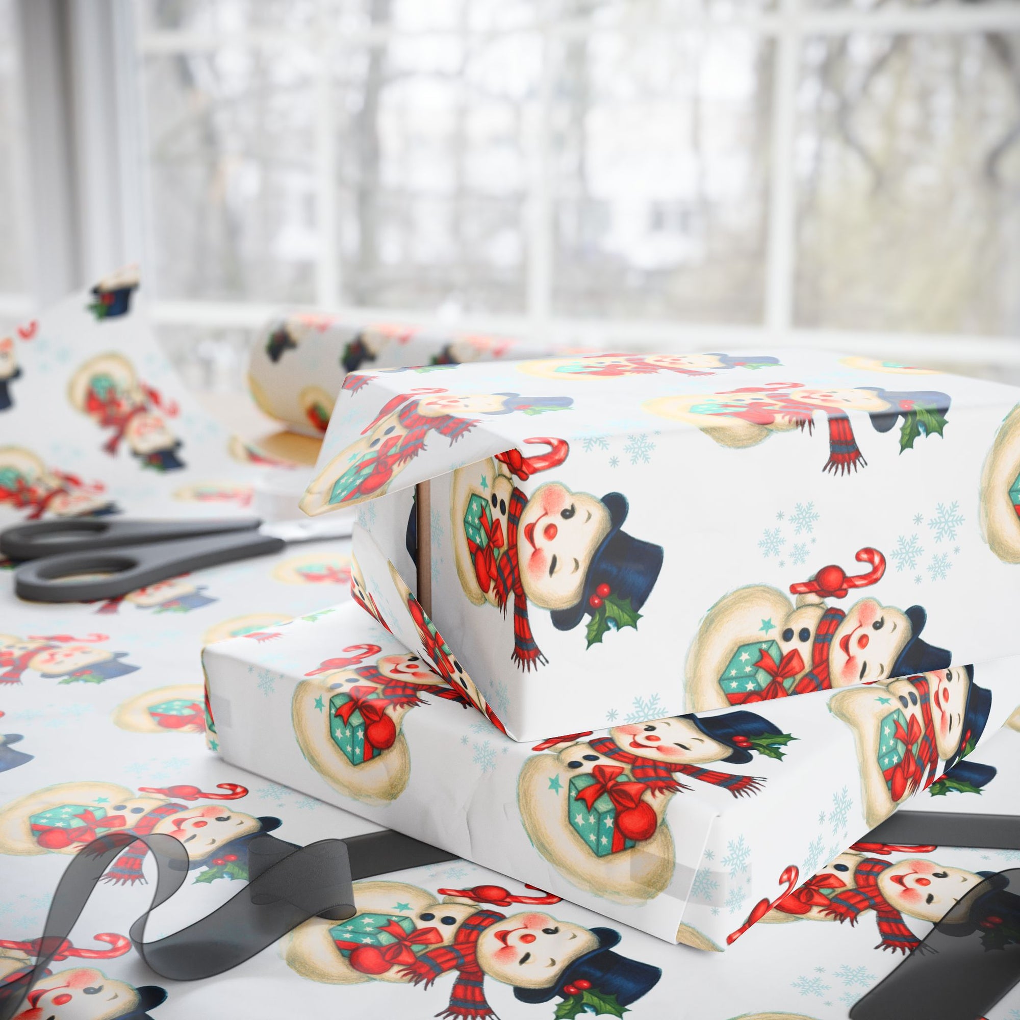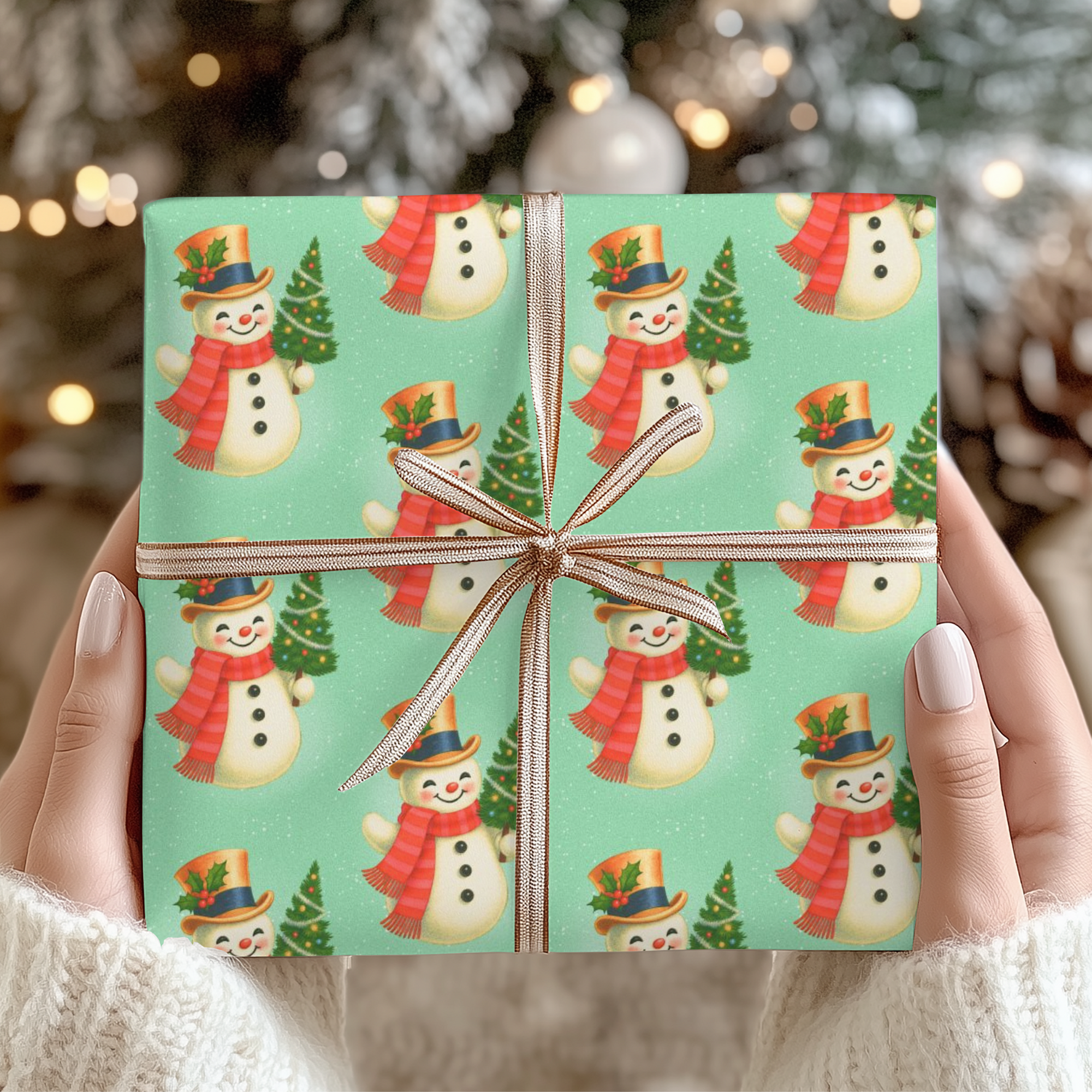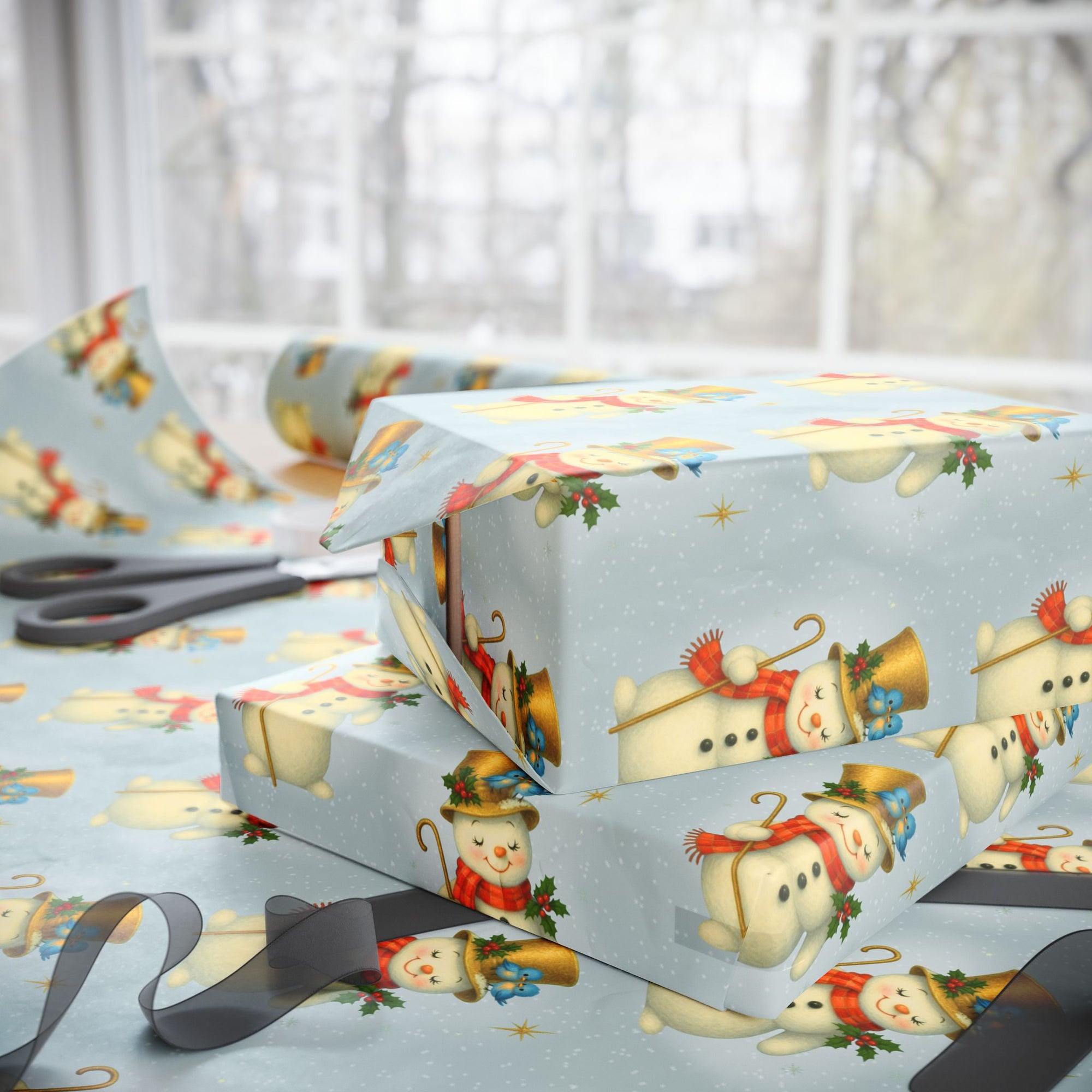 a  box that is wrapped in a christmas design that features a snowman and american flag against a light blue background