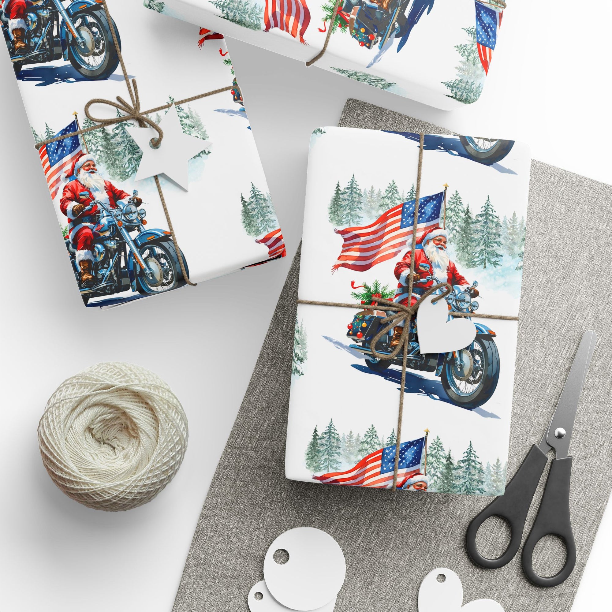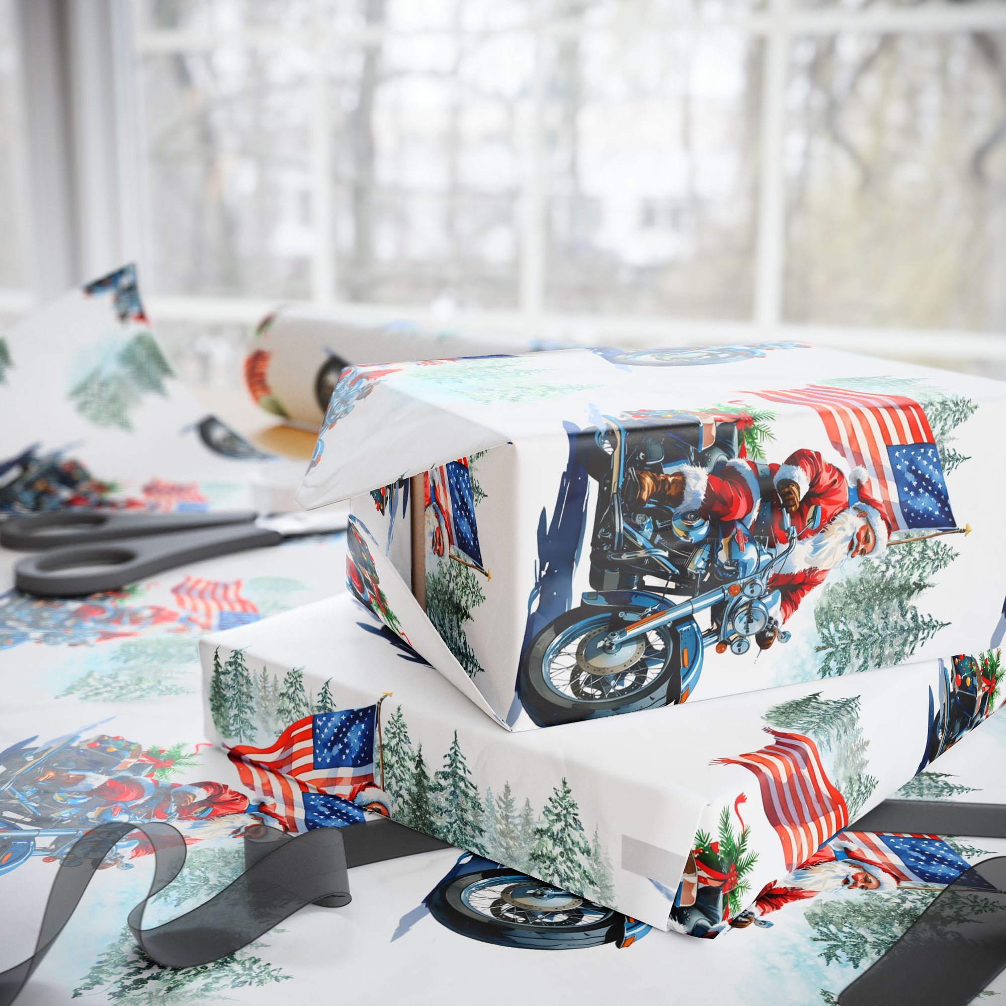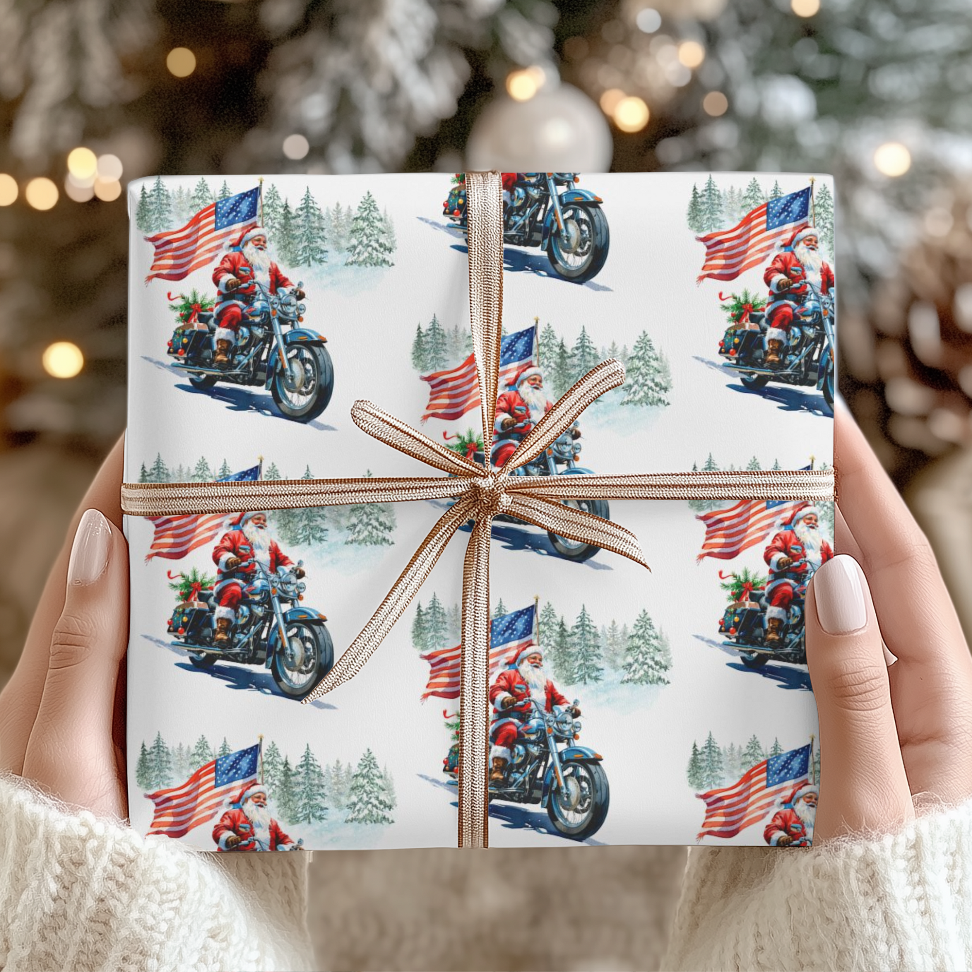 Christmas-themed gift wrap with Santa Claus and American flags under a christmas tree backdrop