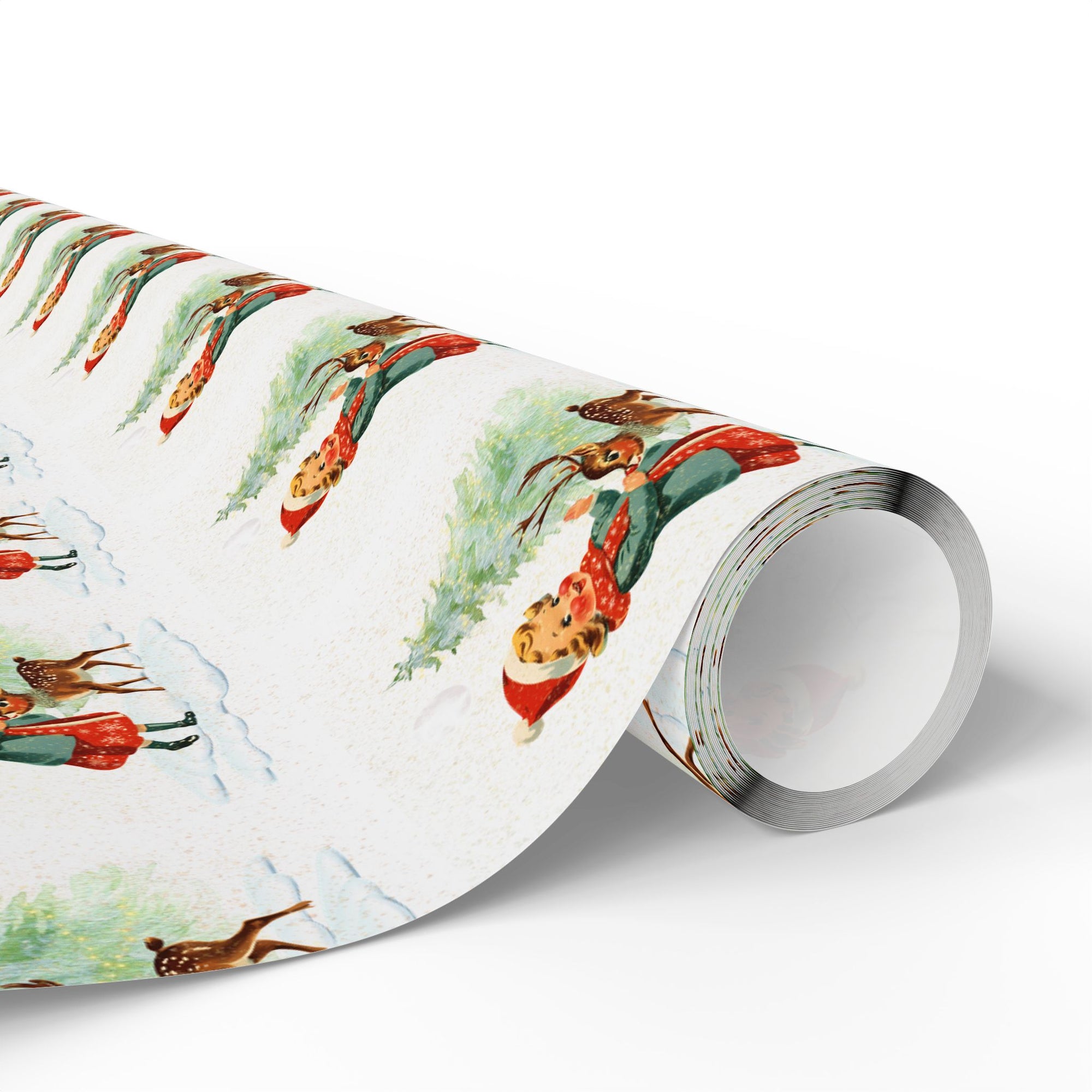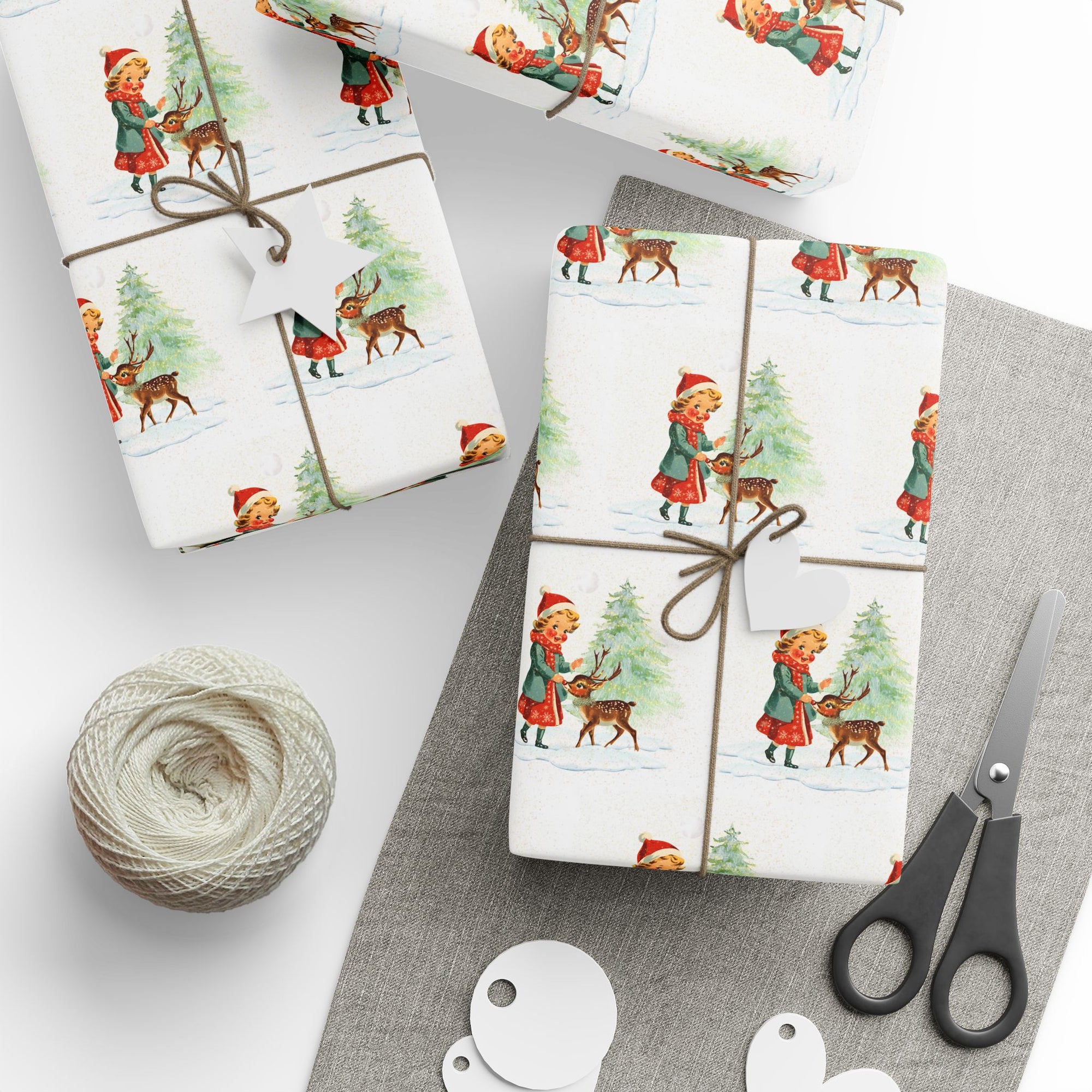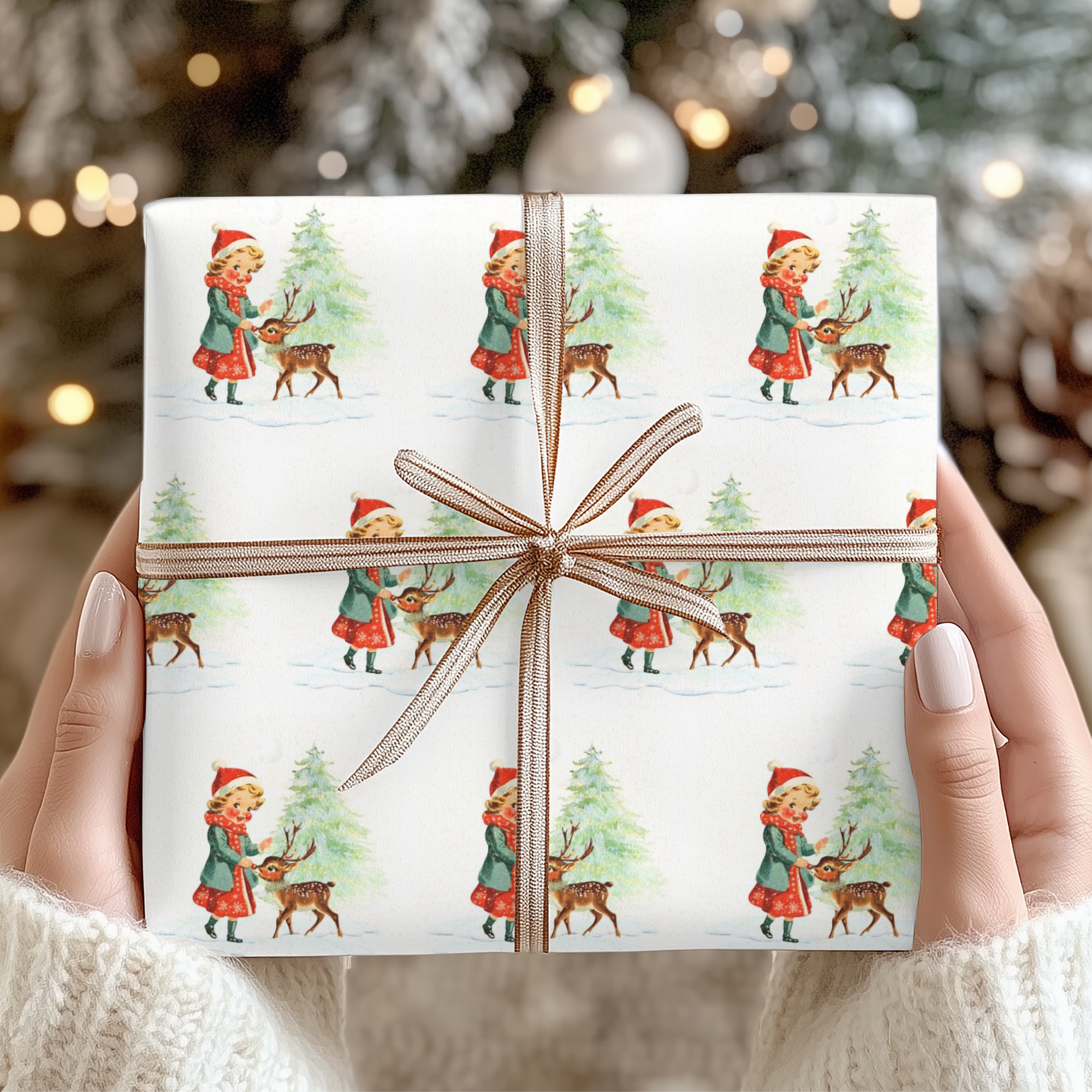 Christmas-themed gift wrap with reindeer and little girl with a red bow on a white background