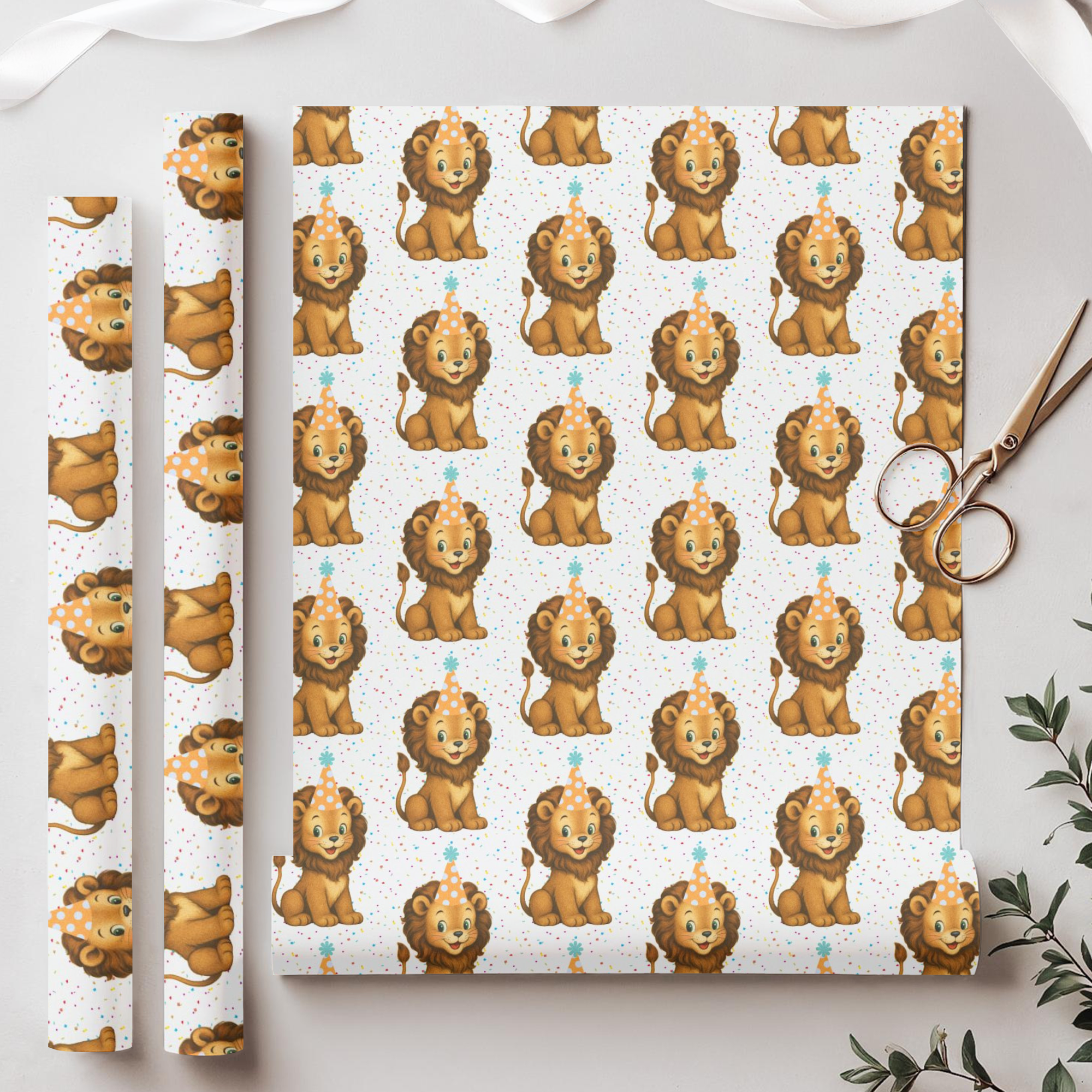 birthday wrapping paper roll in a retro theme featuring a bear and lion with balloons on a white background